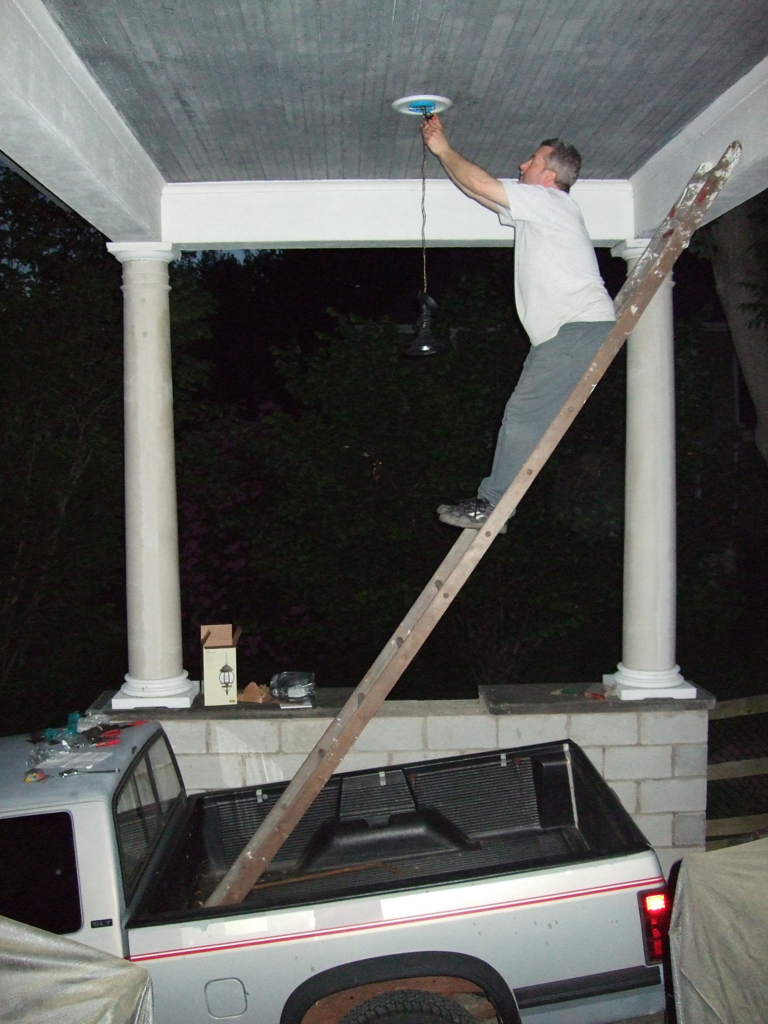 Somewhere between Steps 2 and 3, Mike took his life in his hands to replace the porte cochere light (his idea — the original, 83-year-old one worked, so was just fine in my book). It was dark by the time he finished. I passed the time by discovering you can take some nifty shots with the digital camera at night. (You can’t always tell exactly what you’re aiming at, but…the results are pretty.)