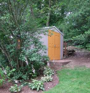 Now the yard has a little peek of color in the back corner, and we can scout out chatchkes to hang on the outside. (Loved some of the rustic garden art at the local arts festival last week, but $42 for something to hang on the shed isn’t in the budget. A few dollars for some old gardening tools and such is more like it.) Let the search begin.