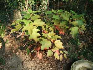 frenzy a couple weekends ago — partly because we keep refining the back yard (to make up for the ongoing mayhem in the front yard) and partly because Lowe’s got its fall planting stock in (nice selection) and a nursery we really like is closing (boo hoo) and had 40% off everything. All that resulted in us buying something like 17 perennials, a flat of ground cover, and 18 shrubs (including this oak leaf hydrangea…and a couple mums for good measure). Guess how I’ve been spending every spare moment?