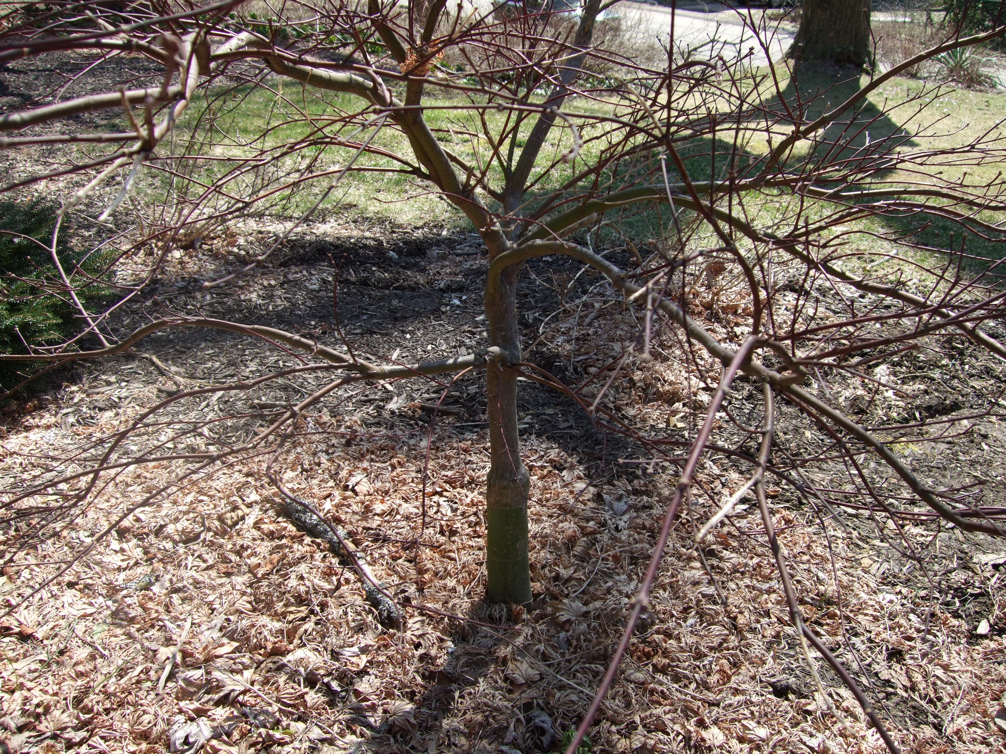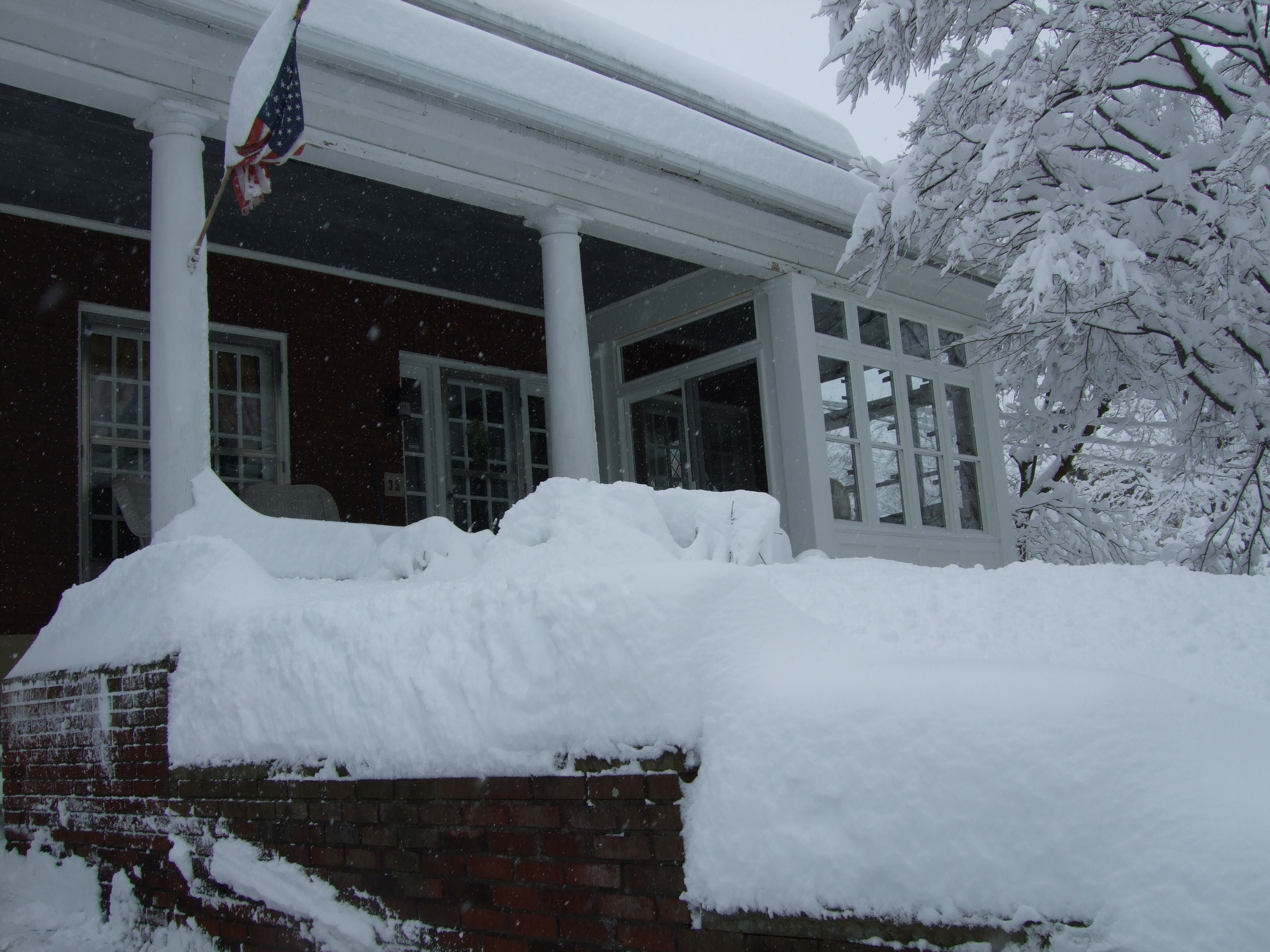 February’s snows did quite a number on my small, ornamental Japanese maple. This is “him” — Laceleaf — buried during one of the big storms. He’s the white blob in front of the second column.