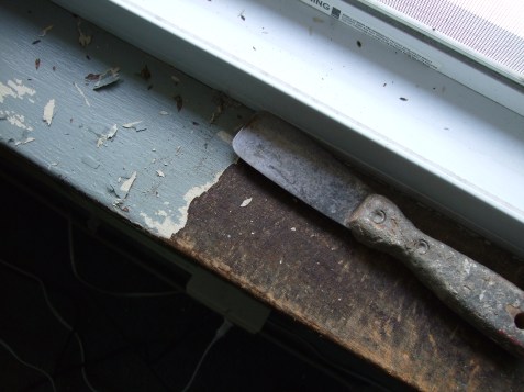 I started with the windows. We’ve been trying to expose the wood sills in every room (because some were left exposed and some were painted over). But of course, like every other room in the house, the idiots painted latex over oil so the top coat of paint easily chips/scrapes off — except when it sticks like glue — and you’re left with the oil-based undercoat, in this case, a dirty-looking creamy-tan color. I’m not sure whoever painted this primed it first, because even this layer can be (mostly) chipped off.