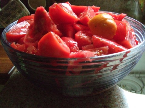 Salt and pepper to taste; small amount of sugar optionalWash tomatoes and cut off stem ends and any blemishes. Cut them up roughly into large chunks or wedges equal to approximately half a standard plum tomato size, smaller if you have then energy, but my theory: why bother?