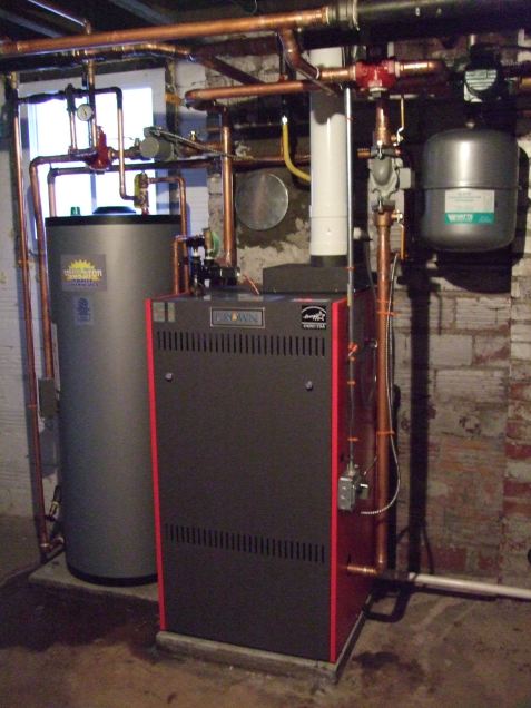 See that nice Energy Star sticker in the upper right corner of this snazzy red Corvette of boilers? That, we hope, will make it all worthwhile, along with the “free money” I mentioned before in the form of a state rebate and the Federal energy tax credit. The hot water heater was a last-minute addition — the boiler heats the water for it, too.
