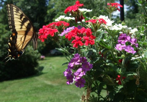 See that dark swath in the yard to the right of the light? I’m trying to ignore that — it’s weeds that have taken over — ground ivy, I think. Now blooming purple at least. I am so not a lawn person…