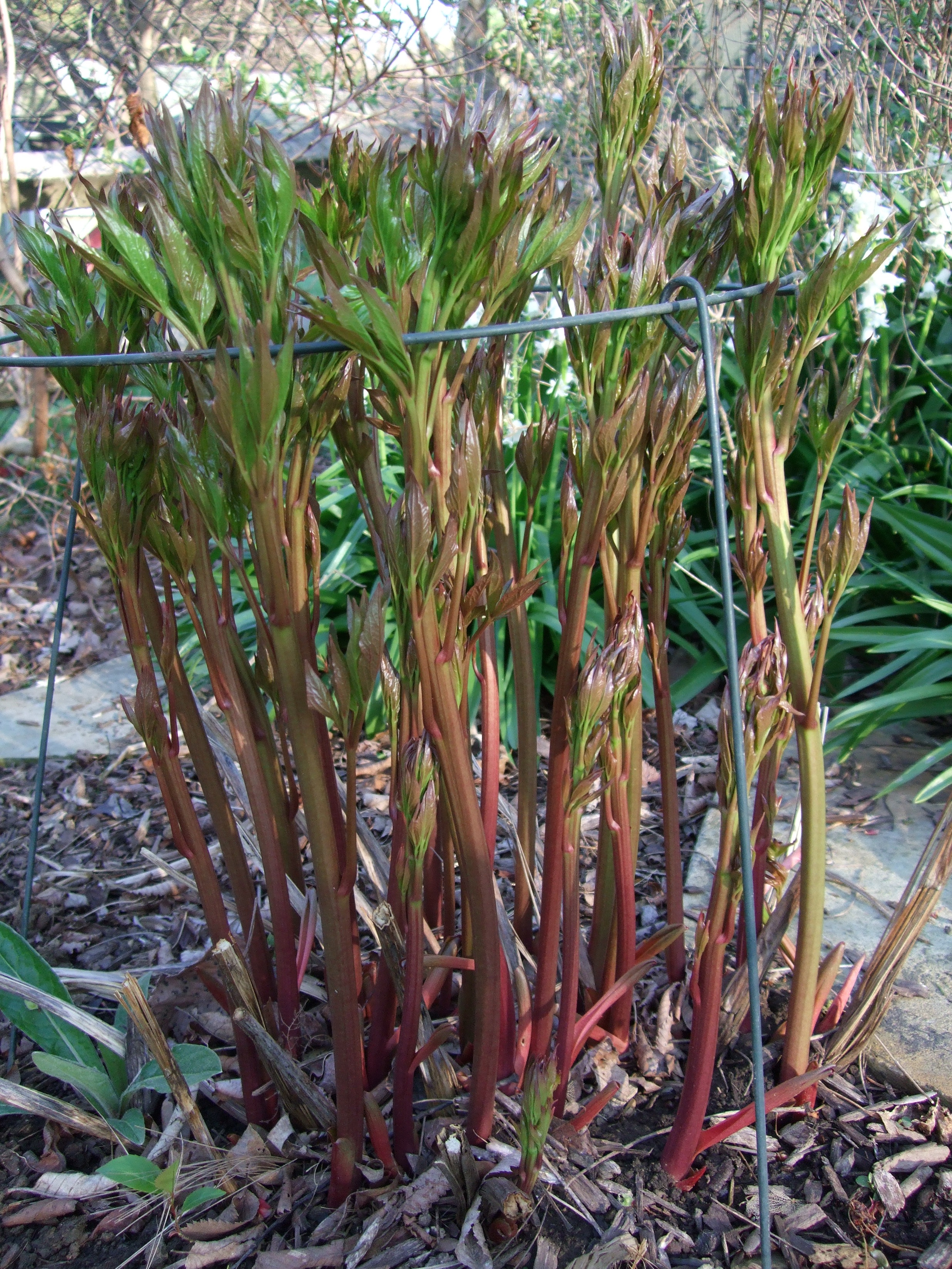 More stuff is up and getting greener — including buds on the peonies before I even thought about getting the ring supports out for them. Had to try to retrofit…just a ring this time; no neat little weaving a grid for the stems to grow through.