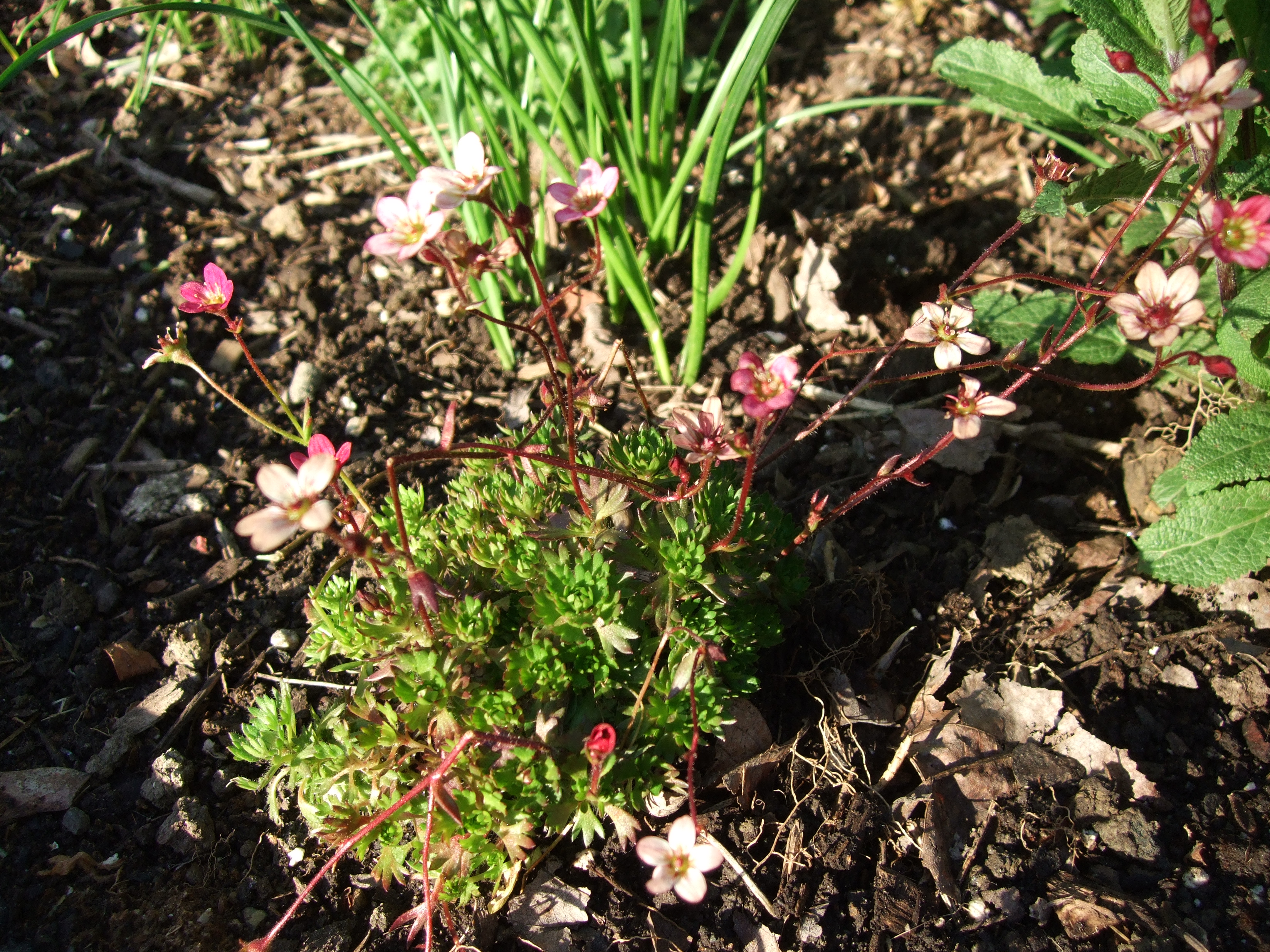 And this adorable Saxifrage…I’m a sucker for the tiny pink flowers perched on their dainty stems. We’ll see how they do — I’m asking a lot of them — expecting them to grow and spread in the small border next to the driveway.