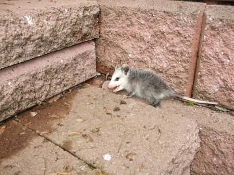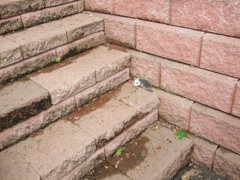 A baby possum — maybe 6″ long (+ tail). By the time I got the camera, he had made his way across the driveway and was starting up the steps toward the backyard.