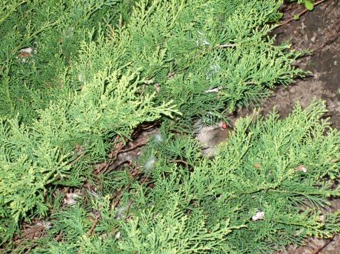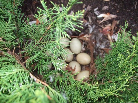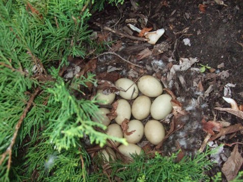 …the duck story is over. I was away for several days, during which time Mike dutifully reported “The duck’s still there.” I got home on Tuesday and only just today ventured out for a walk and took a peek at the ducks. All I saw were a few broken shells. It didn’t even look like a nest anymore, just a depression in the mulch.