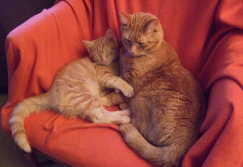 What I found, of course, were people who said orange cats (called “ginger cats” in Britain) were the best and others who thought them nothing special. The sweetest thing I found, though, was a Christmas story* about tabbies (not just orange ones) and the distinctive “M” on their foreheads that warmed my heart and convinced me that our orange guys are special — no matter who else thinks so.