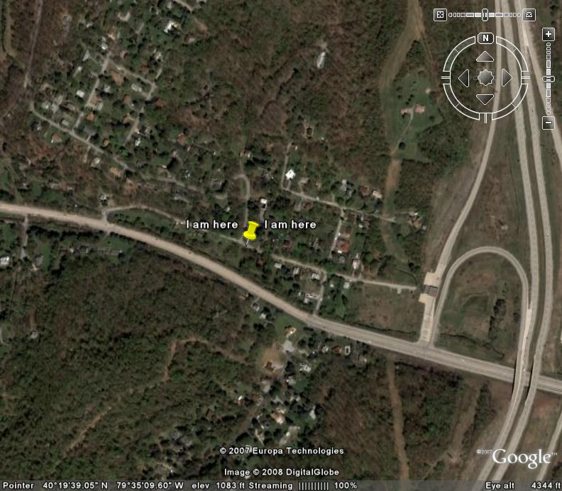 i-am-here.jpgThese boots were clearly not made for walkin’. Except for a stint at college 2 hours away (I transferred back to Pittsburgh sophomore year), I’ve mostly been within 20 minutes of the house I grew up in. Now, living about an hour east of there (the Google Earth map you see is accurate), I still miss “home.” Yes, folks, all those people who criticize Pittsburghers as being “too provincial” are right. I was in college before I had even been to the South Hills — about 45 minutes away (but with a bridge and a tunnel between us in the North Hills). I know many fellow ‘Burghers who consider that length of drive in any direction from where they live to be “All that way? Over there? How do you even get there?”