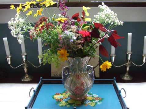 But those’ll have to wait. At least until the current bumper crop of blossoms goes by and the wilty summer doldrums set in. For now, I’m enjoying what has always been this chintz-lovin’-flower-fanatic-cottage-dwelling-wannabe’s biggest motivation to garden: being able to walk outside my door, wander around the yard a bit, and come back with this…for free!