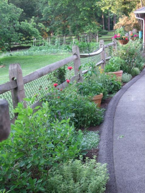 Mike created this holder for my upside-down tomato buckets from leftover wood from the swingset we dismantled a few years back (it still needs a coat of stain). Wouldn’t you know, though, all the tomatoes (yours too) are in peril from the tomato blight again this year. Our neighbor reported that while she was off work last week (she’s a garden center manager at Wal-Mart), the store had to destroy all of its tomato plants because they had blight. She sprayed her plants yesterday (that’s her awesome veggie garden in the background of the driveway border, 3 pix up). I”m still trying to decide what to do. I’d hate to lose all this hard work.