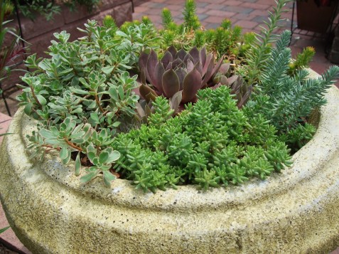 Also, after having admired succulents in living wreaths and living walls for years, I tried my hand at planting some in our concrete planters. Very different from colorful annuals, and no telling how/if they’ll survive over the winter, but I really like them.